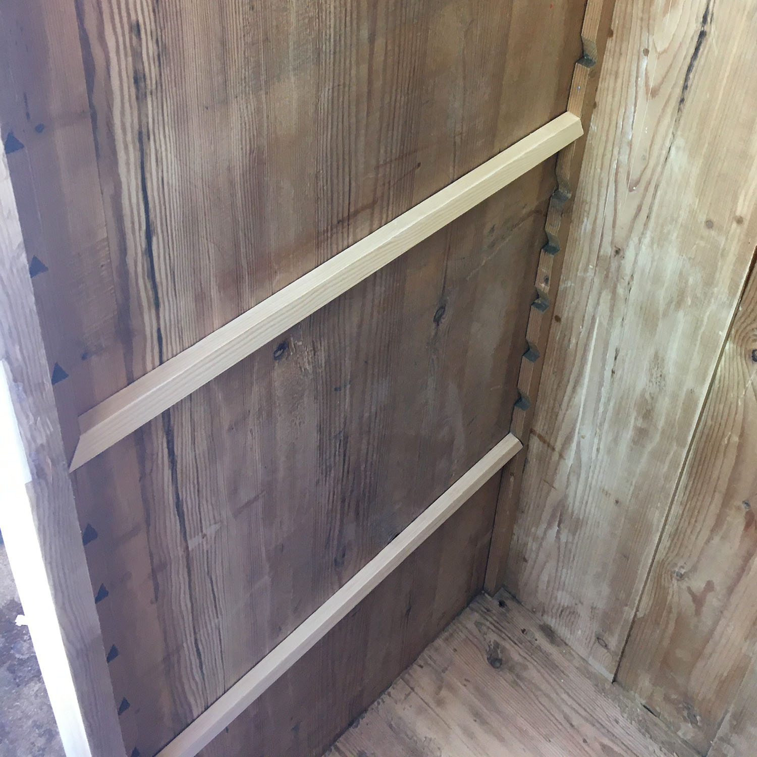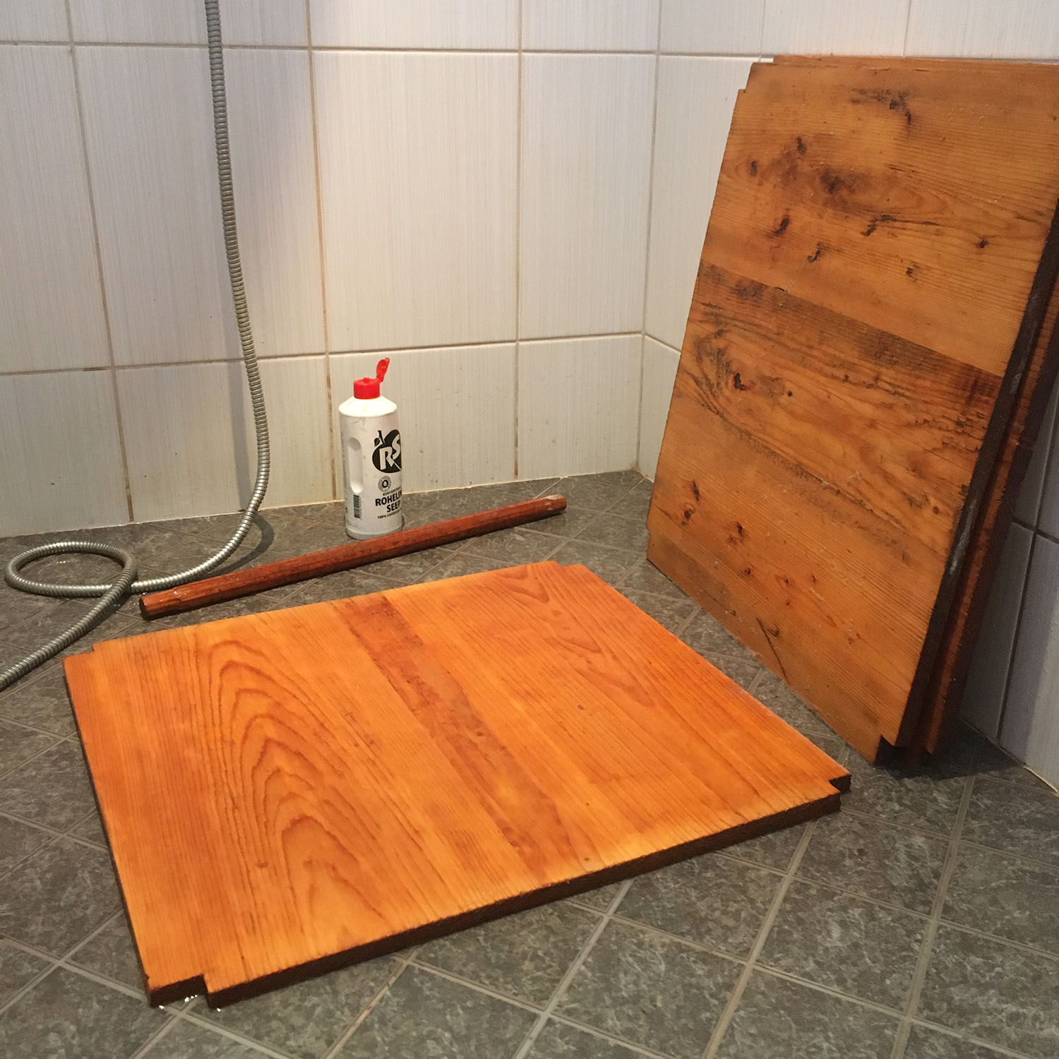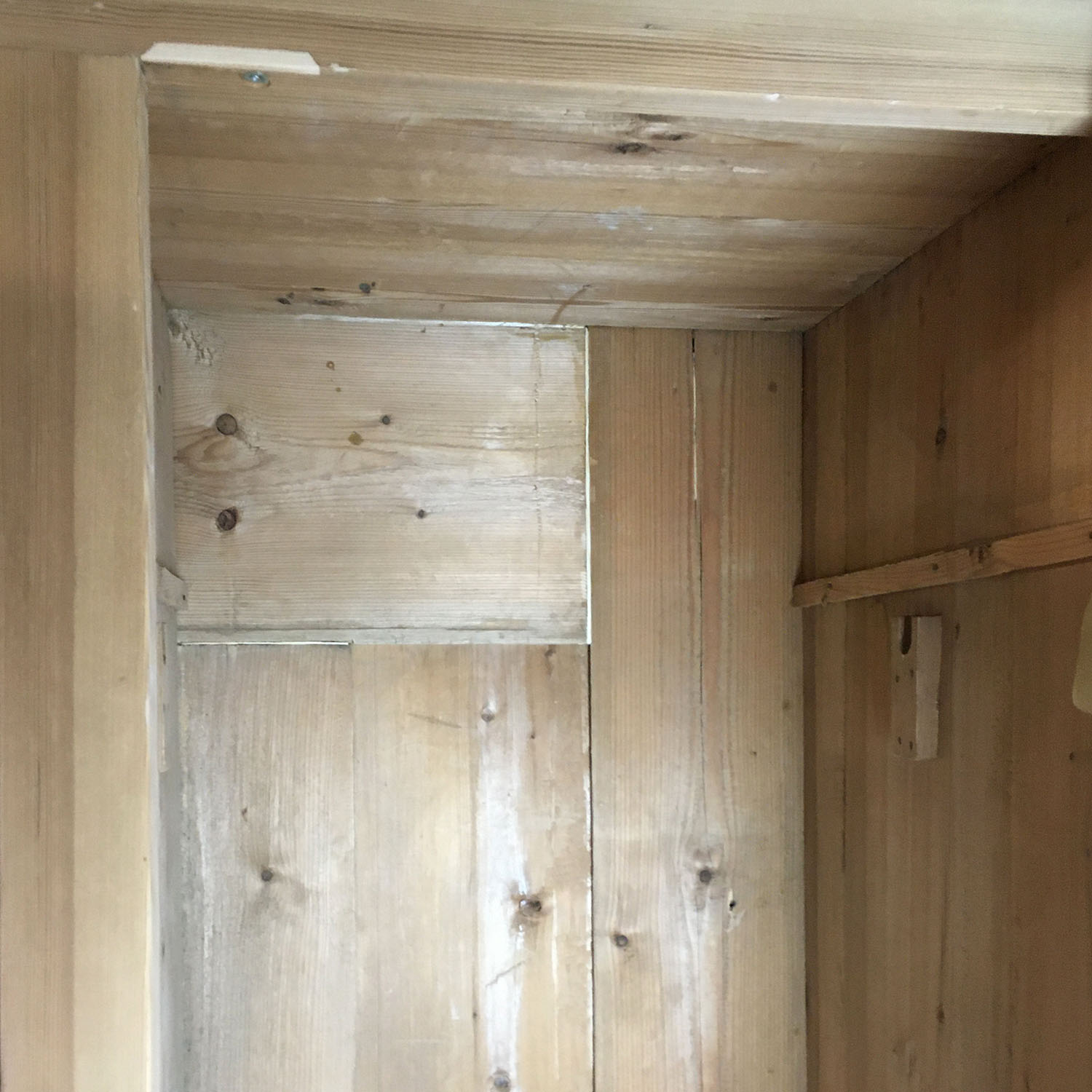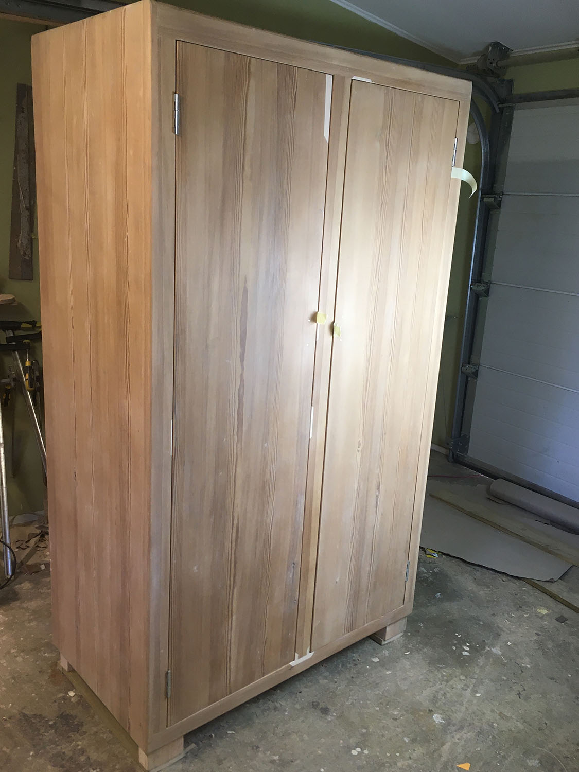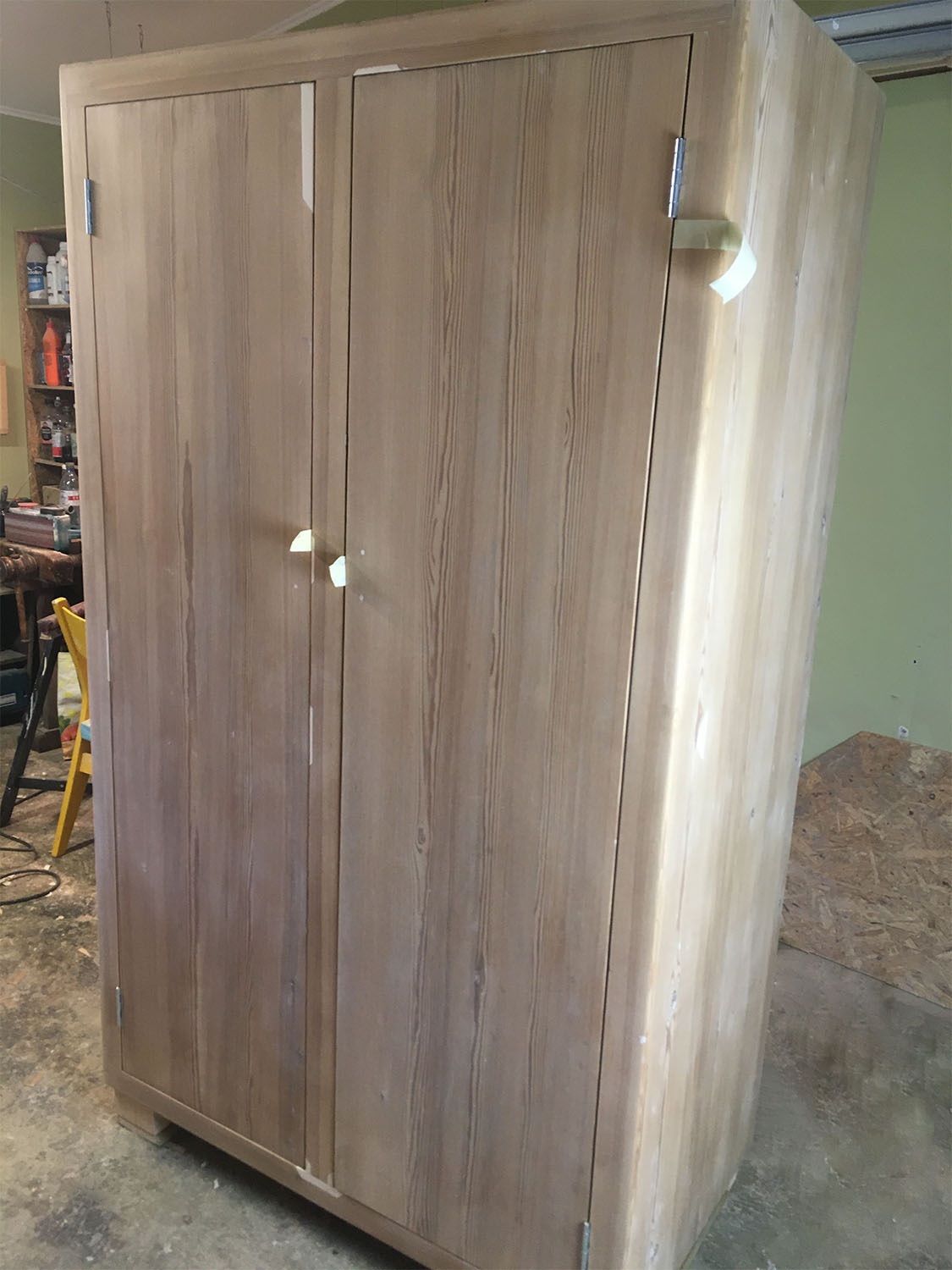 Riidekapi parandamine algas kapi ja riiulite süvapesust. Riiulid said pestud rohke sooja vee ja rohelise seebiga. Riiulid kuivasid mitu nädalat pressi all, et vähendada kõmmeldumist. Pärast kapi kuivamist liimisime korpuse kinni ja tegime korpuse, tagaselja ja uste plommparandused. Seejärel valmistasime uued puidutüüblitega kinnituvad jalad kliendi materjalist, mis oli kapiga ühevanune. Uued riiulikandurid valmistasime vanade eeskujul ja toonisime ülejäänud riiulikanduritega sarnast tooni. Uued hinged said hallid ja pisut pikemad. Samuti proovisime vasakpoolse kapiosa põhja plekki välja pesta ja pleegitada.